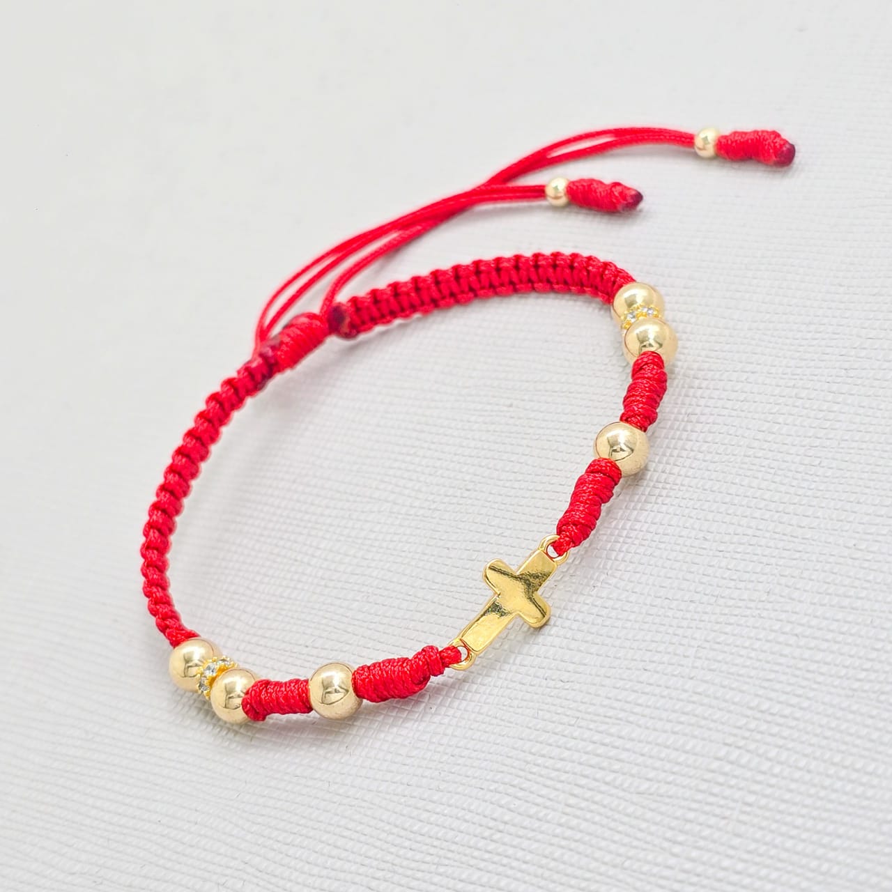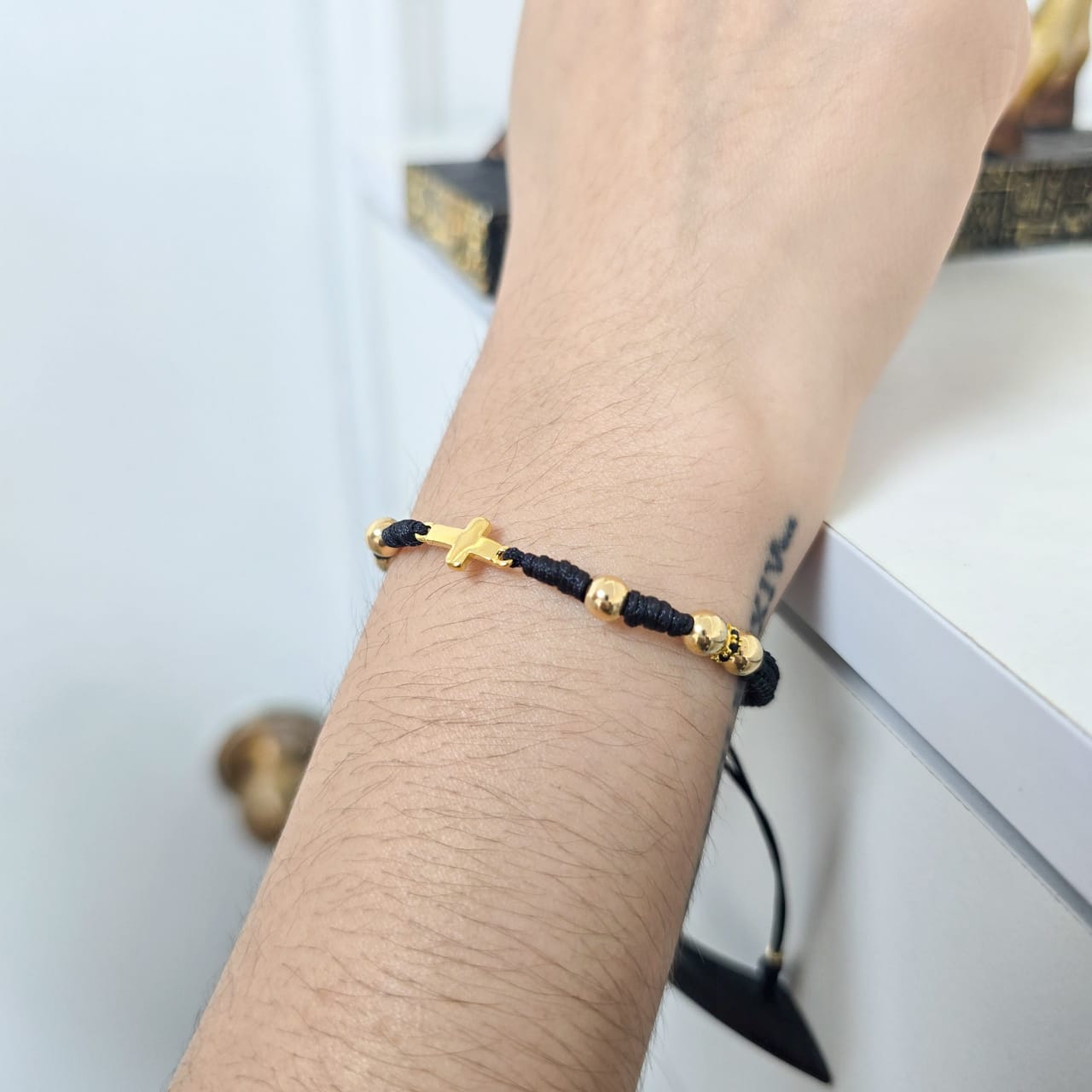 - Brazalete tejido de Protección, balín liso dorado de 5mm con Herraje de Cruz En Oro Laminado 18k
