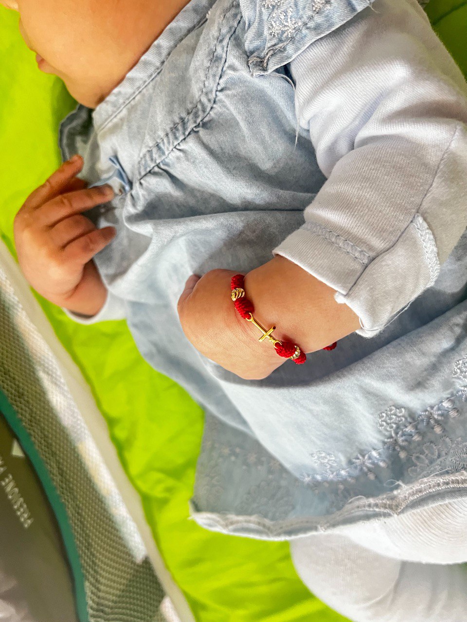 - Brazalete Rojo Con Cruz y Balín de 5mm En Oro Laminado 18k
