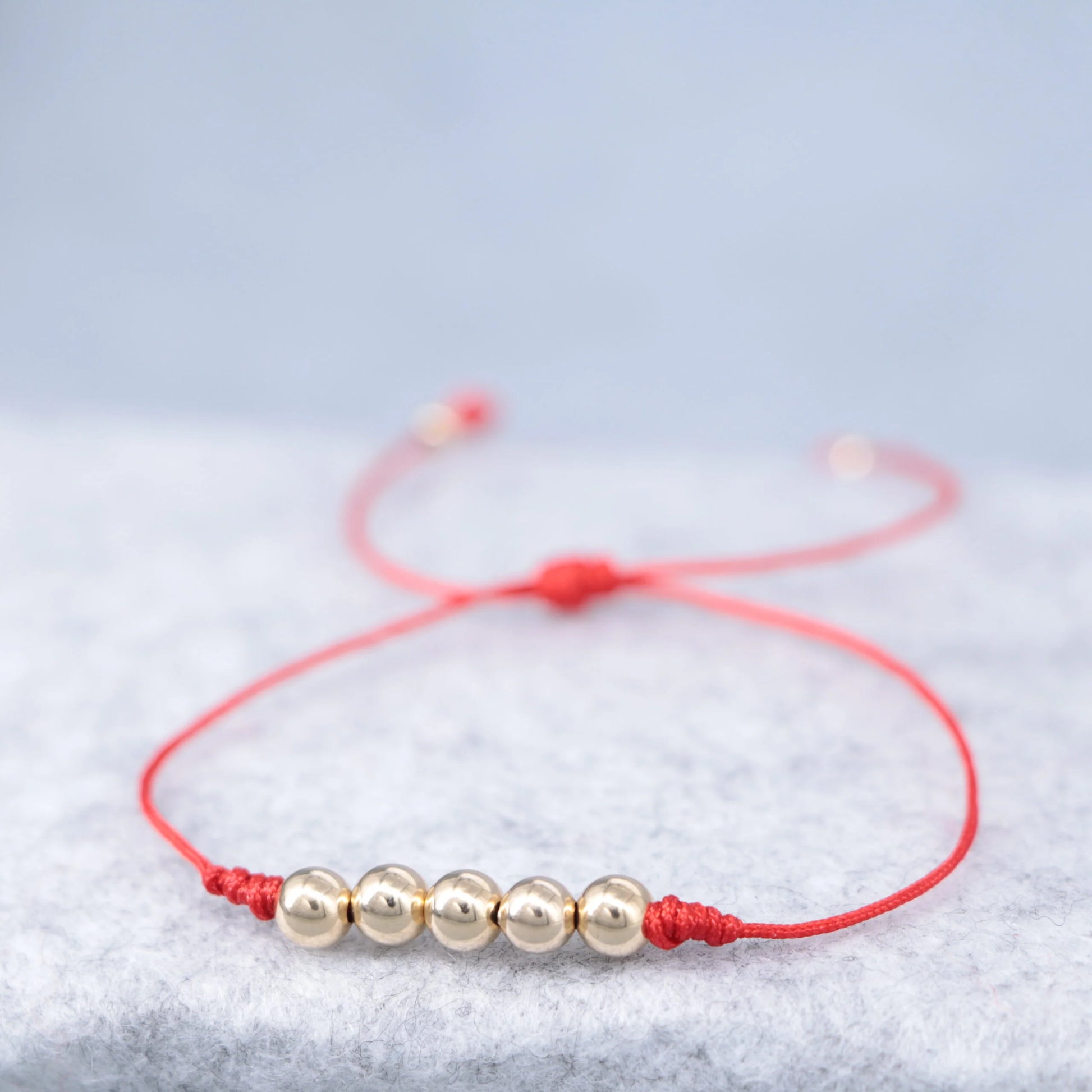 - Brazalete hilo rojo en técnica de nudos con balin liso dorado de 6mm en oro laminado 18k