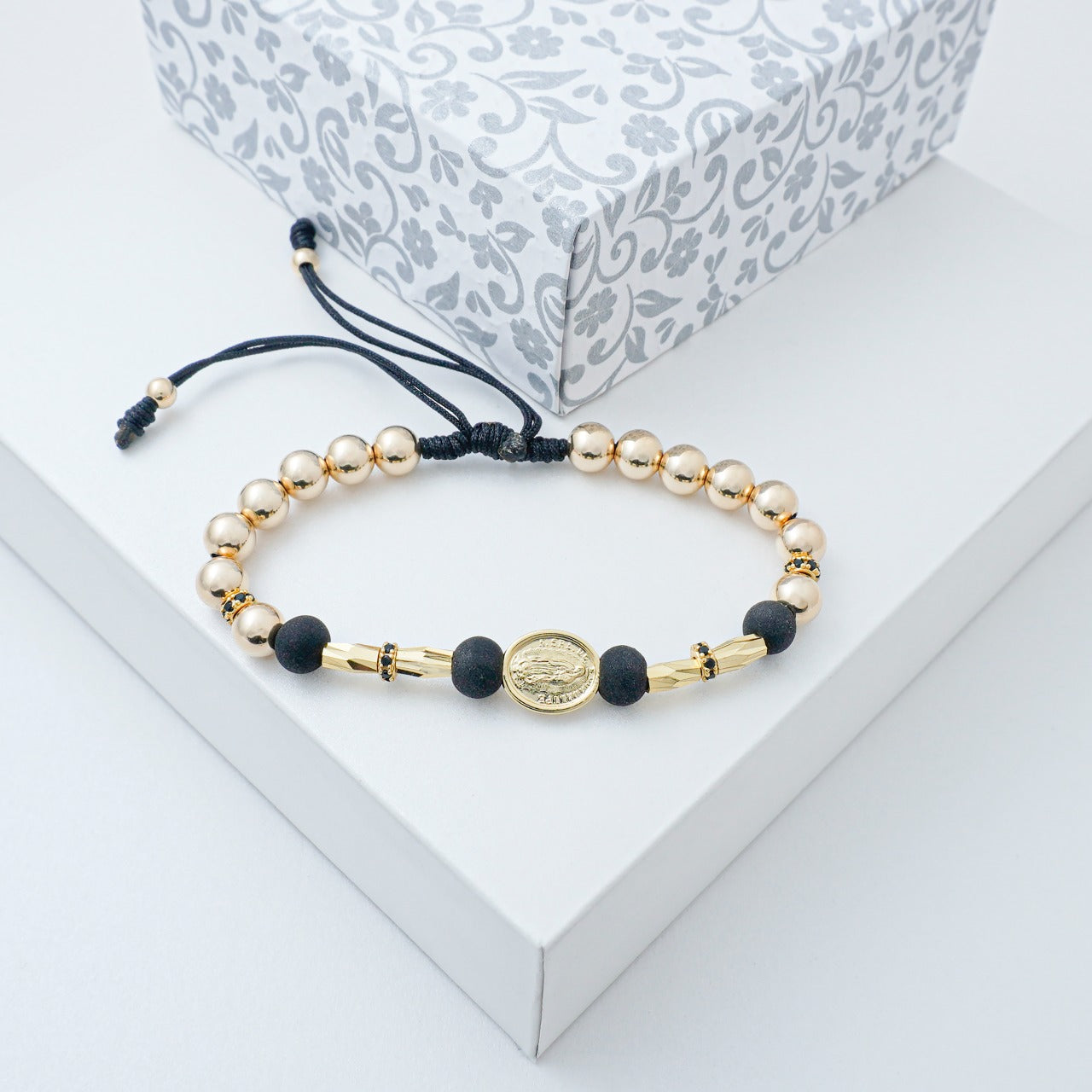 - Brazalete Negro con Herraje de Virgen de Guadalupe, Neopreno de 6mm, balin dorado de 5mm, y Canutillo en oro laminado 18k