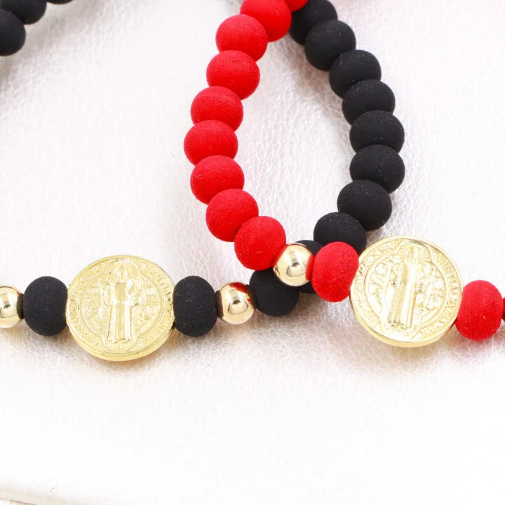 - Brazaletes X2 (Negro y Rojo) O del mismo color, san benito con neopreno, balin dorado de 5mm en oro laminado 18k