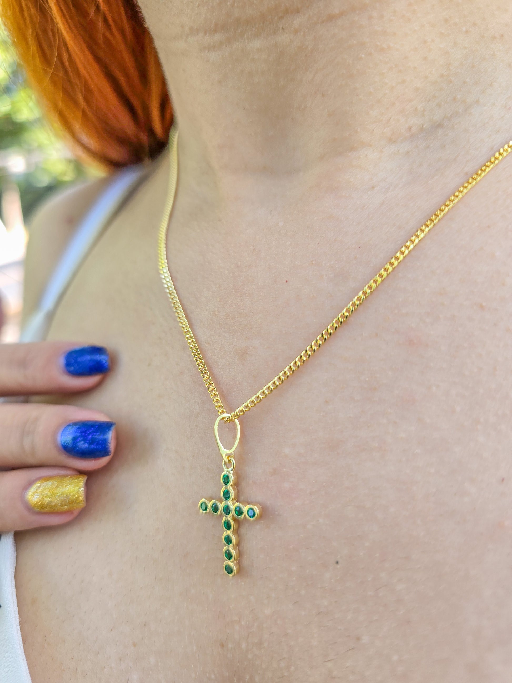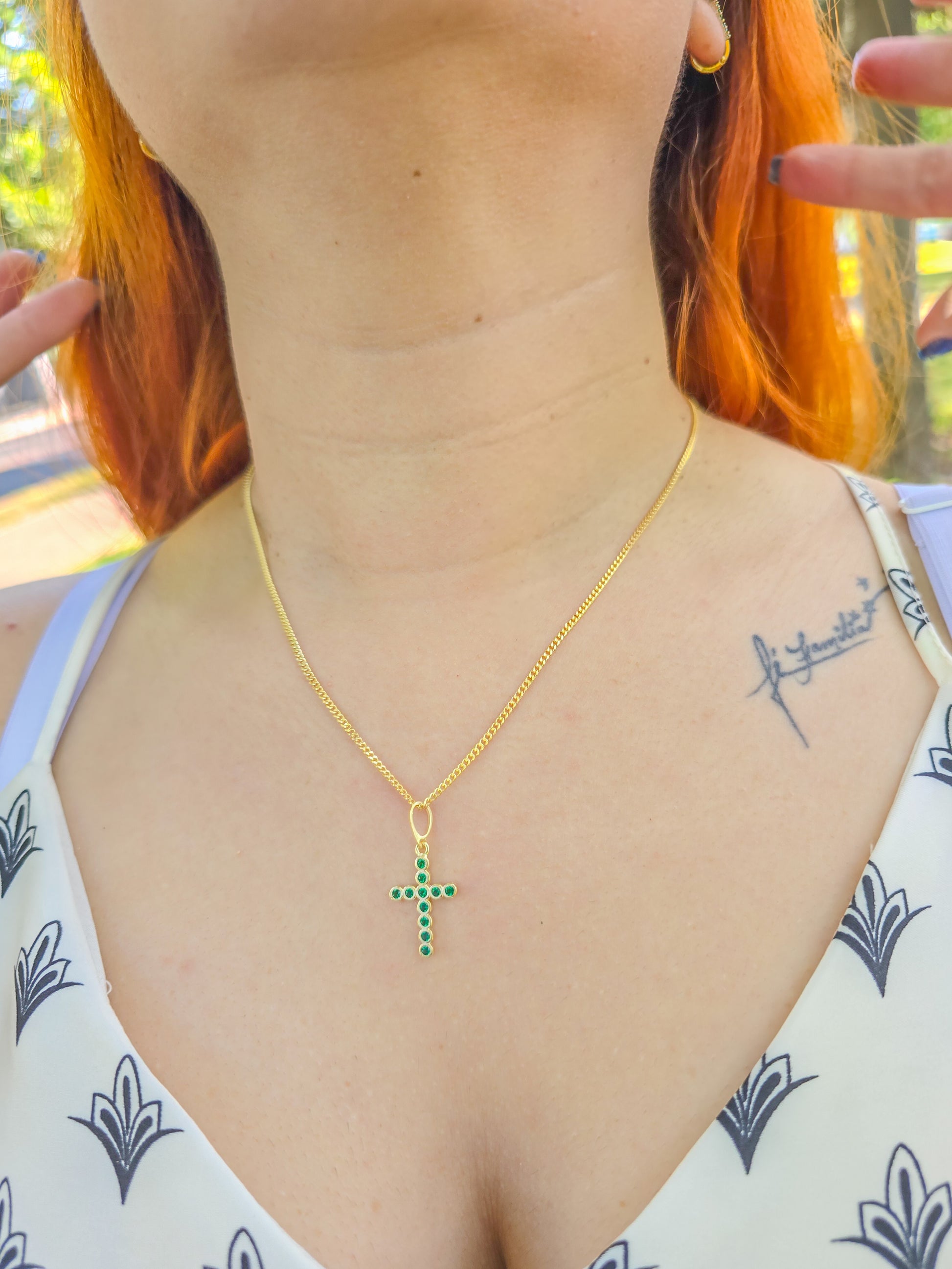 - Colgante Cruz Mini Swarovski Con Cadena Cubana Delgada Oro Laminado 18k