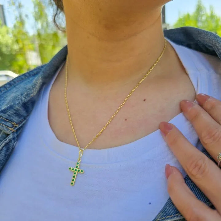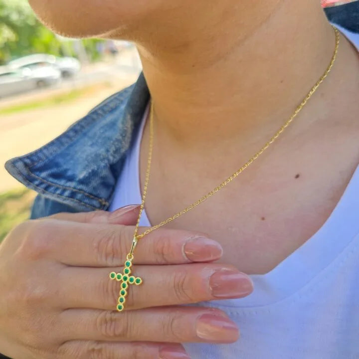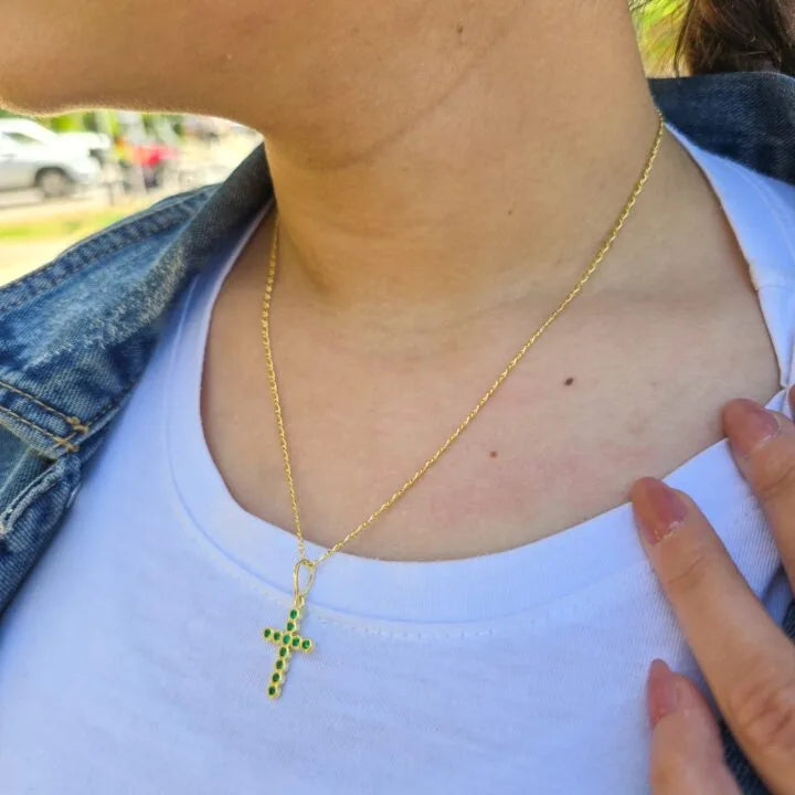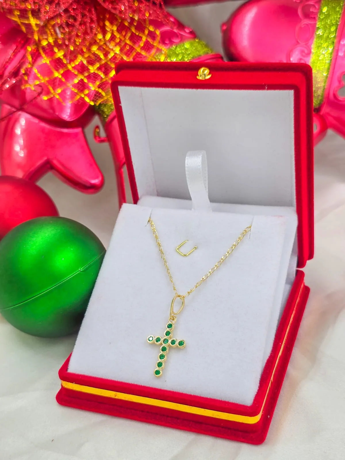 - Conjunto Cadena Y Colgante Cruz Verde Oro Laminado 18k