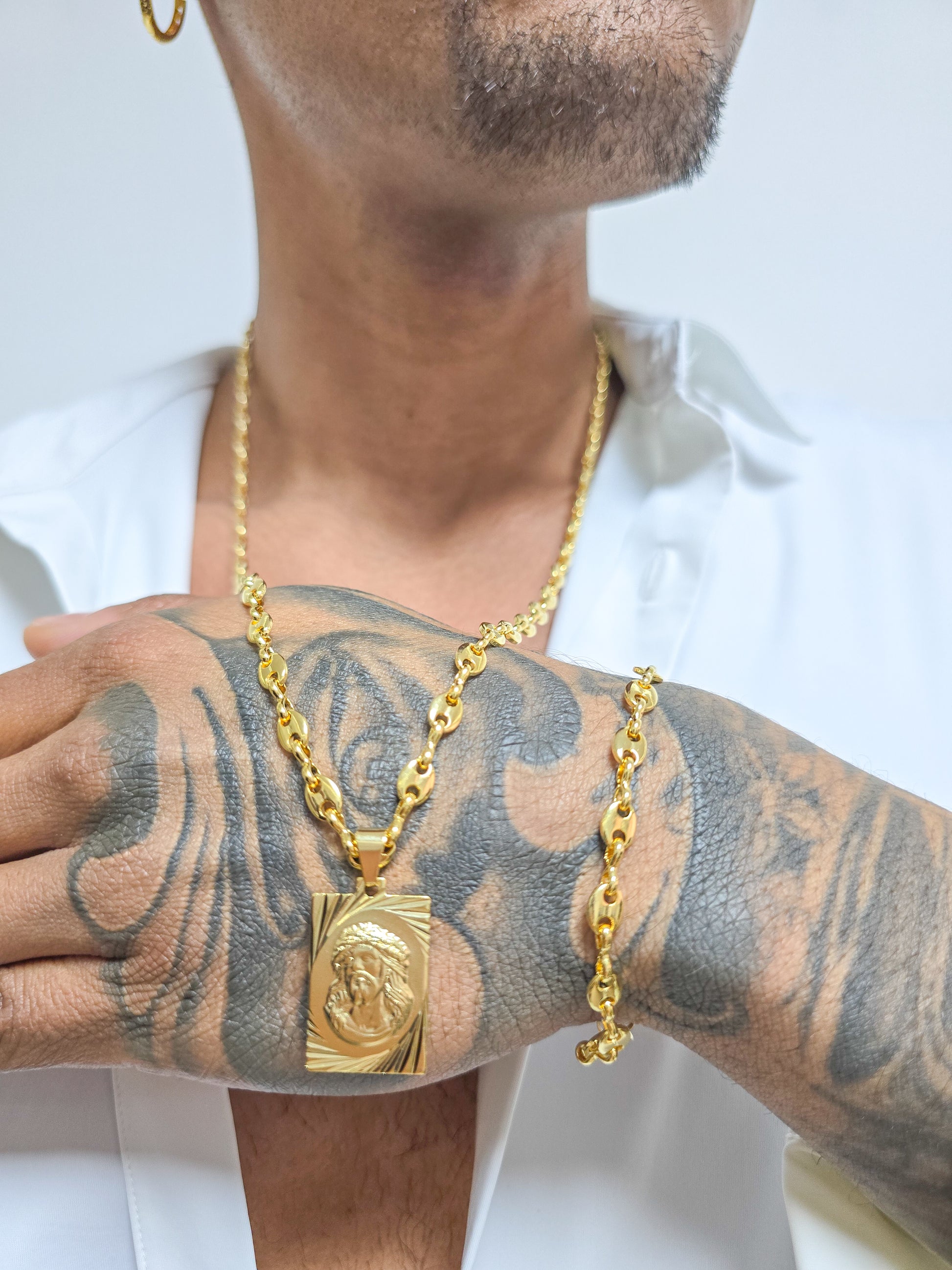 - Cadena Tejido Gucci Semi Gruesa con Colgante Rostro Placa Diamantada En Oro Laminado 18k