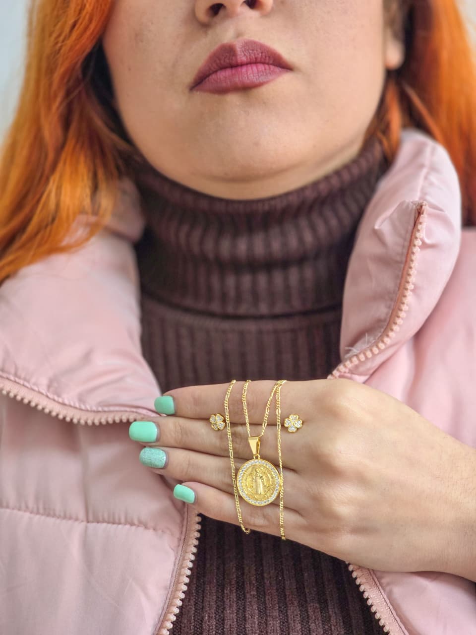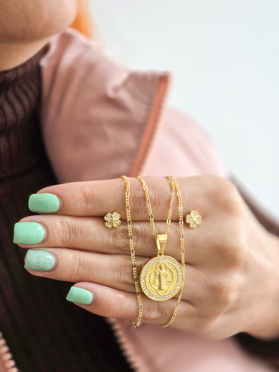 Set Cadena Diamantada, Colgante San Benito y Arete Clover Oro Laminado 18k