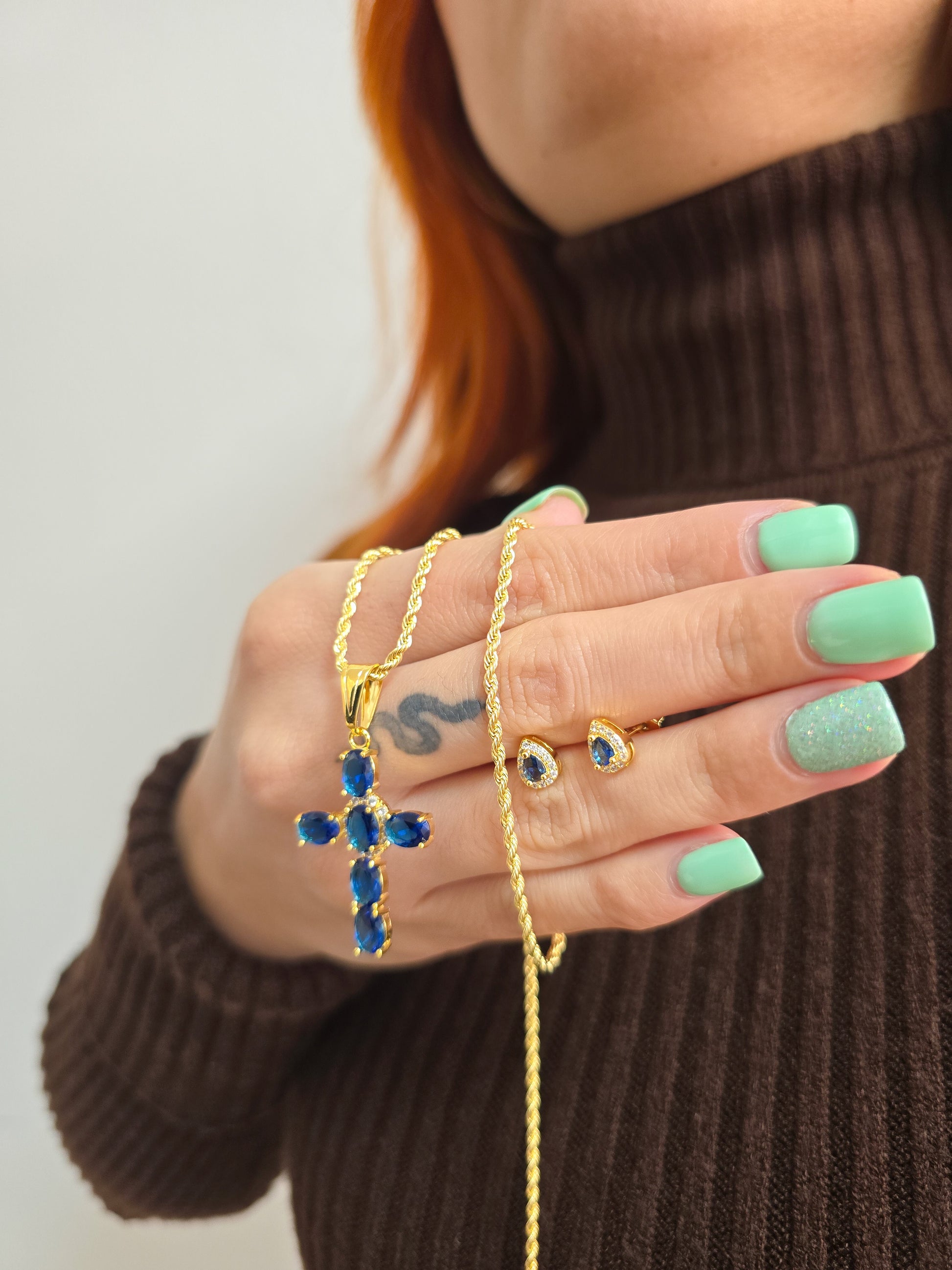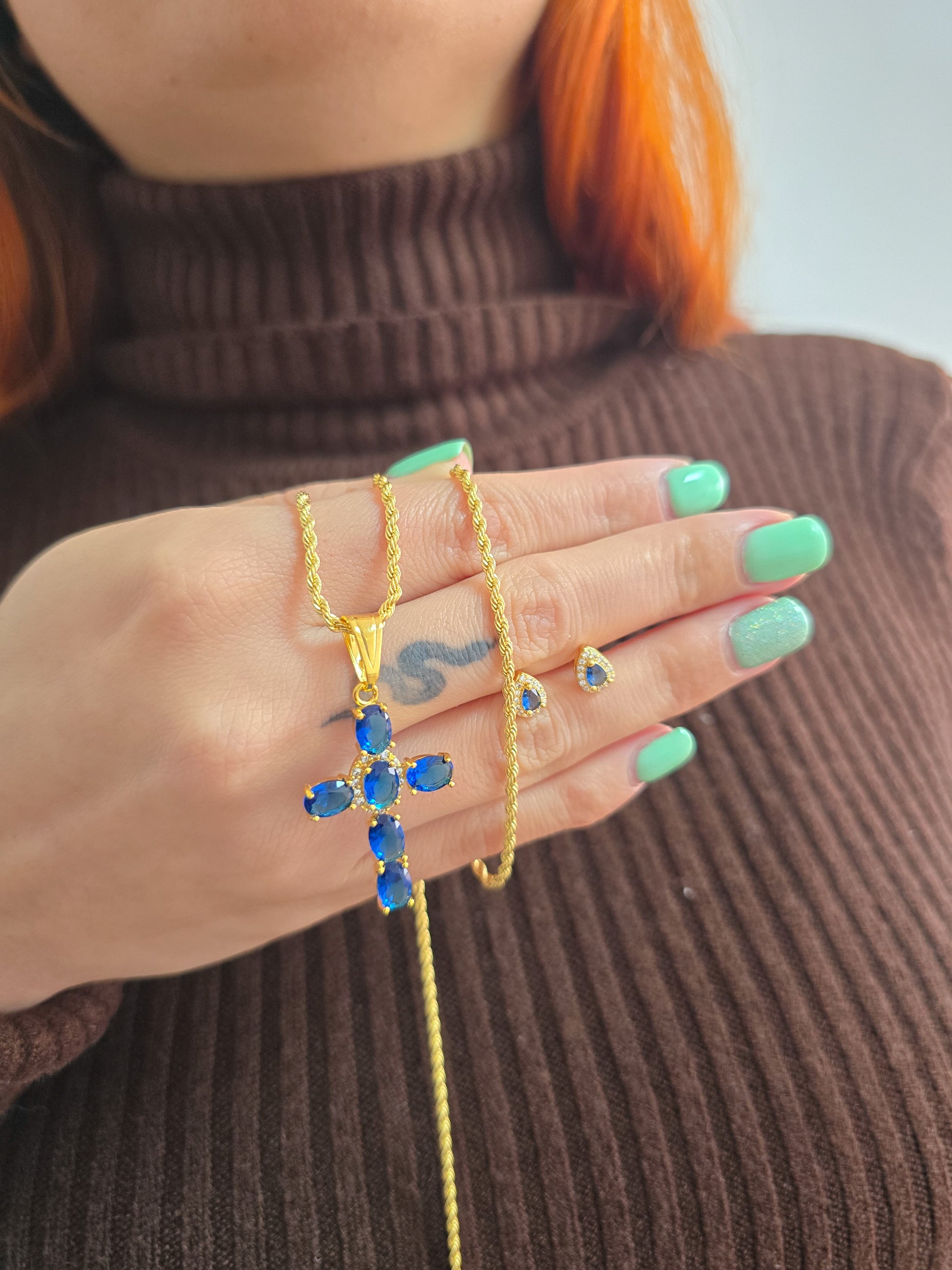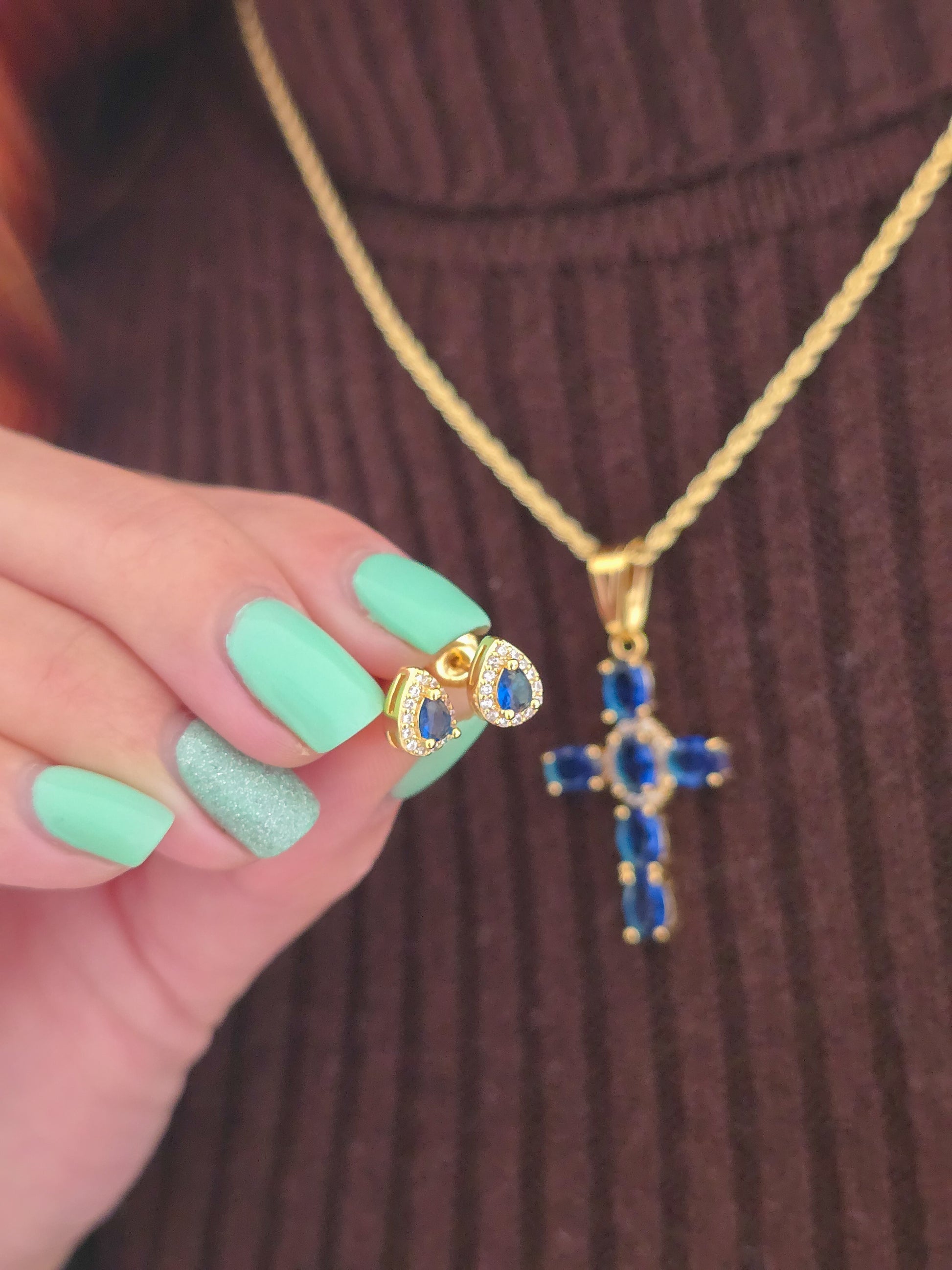 Set Cadena Tejido Tourbillon, Arete Gota Bordes Circonias Y Colgante Cruz Brightness Oro Laminado 18k