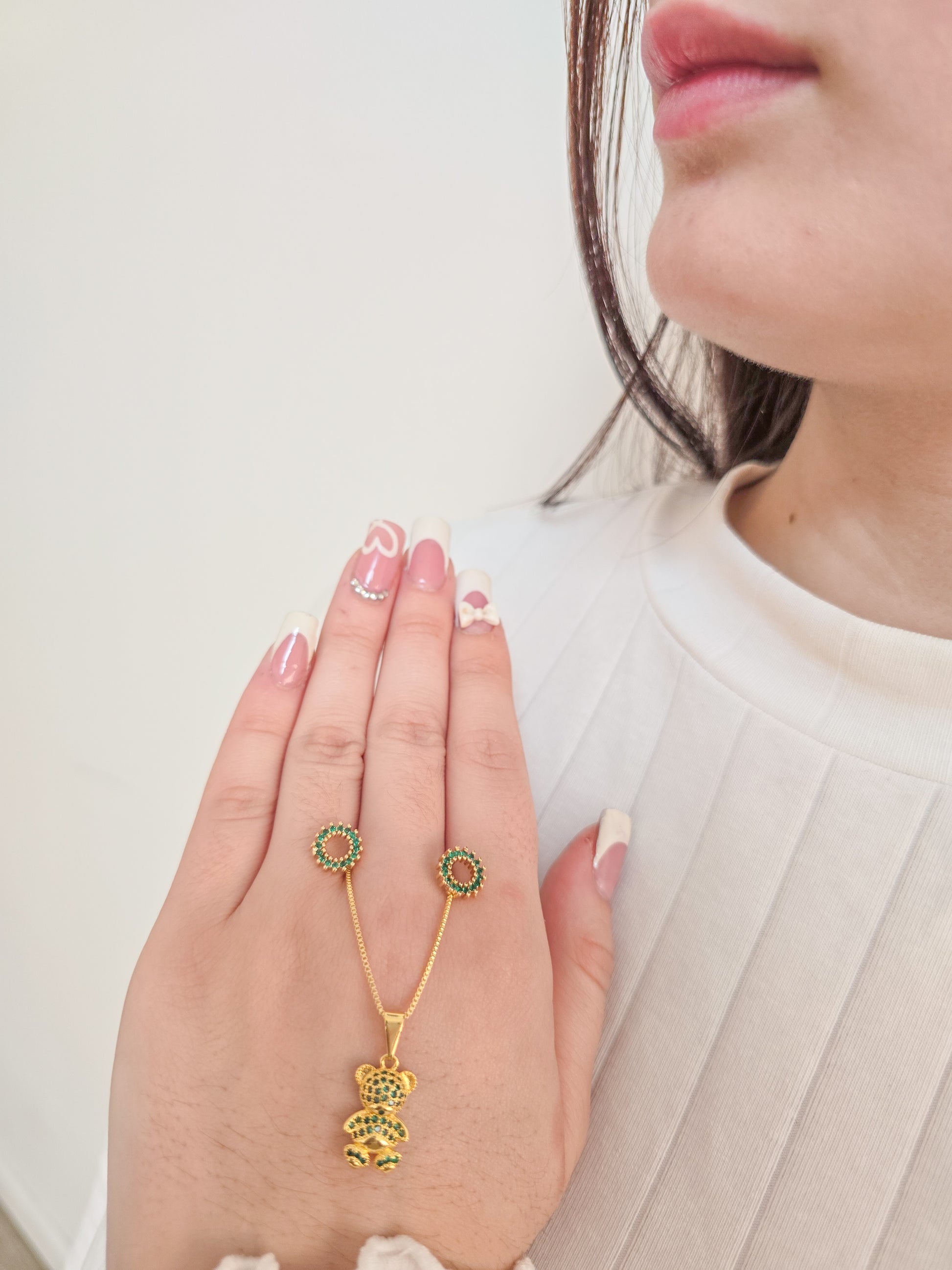 - Cadena veneciana tejida, Colgante Oso Bear Y Arete Rainbow Verde en oro laminado de 18k