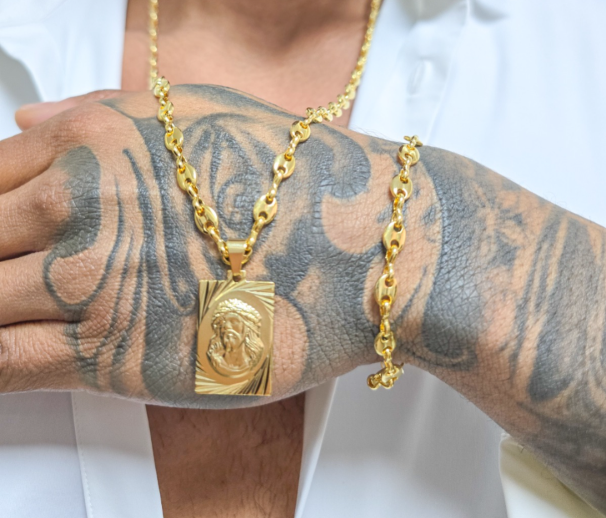 Set Gucci Cadena, Pulsera y Colgante Rostro Placa Diamantada Oro Laminado 18k